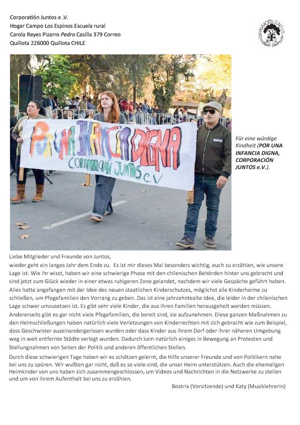 Unser gemeinnütziger Verein „JUNTOS e.V.“ ist seit 30 Jahren Träger des „ Hogar Campo Los Espinos“ in San Pedro in der V. Region von Chile, das einige der ärmsten Kindern Heim, Geborgenheit und Ausbildung im Bauernhof oder den Werkstätten bietet. Die angeschlossene Landschule besuchen weitere Kinder aus der Umgebung.